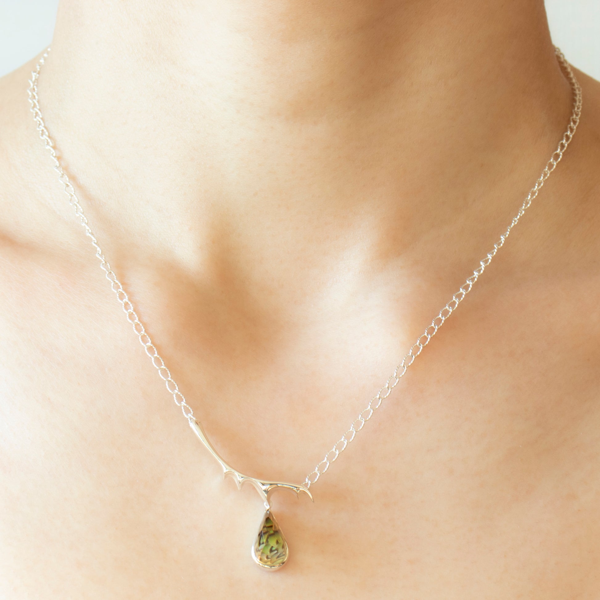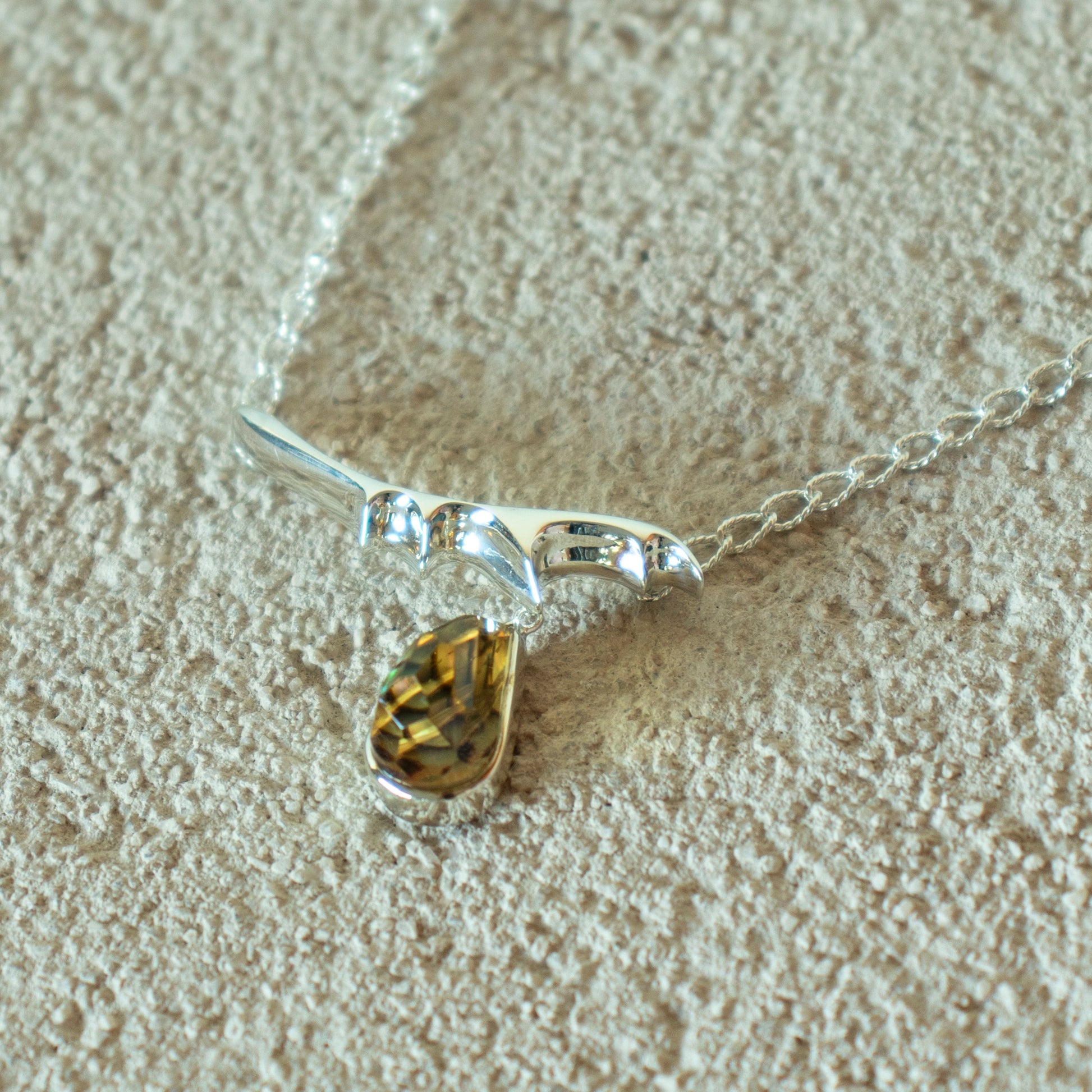 シトリン/クリアクォーツのダブレットルース。漣の様なカットがシェルの虹色単体では表すことのできない複雑な光の屈折を生み出す。美しく瞳に光る雫の様に仕立てたネックレス